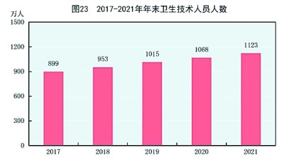 年末全國共有醫(yī)療衛(wèi)生機構(gòu)103.1萬個,其中醫(yī)院3.7萬個,在醫(yī)院中有公立醫(yī)院1.2萬個,民營醫(yī)院2.5萬個;基層醫(yī)療衛(wèi)生機構(gòu)97.7萬個,其中鄉(xiāng)鎮(zhèn)衛(wèi)生院3.5萬個,社區(qū)衛(wèi)生服務(wù)中心(站)3.6萬個,門診部(所)30.7萬個,村衛(wèi)生室59.9萬個;專業(yè)公共衛(wèi)生機構(gòu)1.3萬個,其中疾病預(yù)防控制中心3380個,衛(wèi)生監(jiān)督所(中心)2790個。年末衛(wèi)生技術(shù)人員1123萬人,其中執(zhí)業(yè)醫(yī)師和執(zhí)業(yè)助理醫(yī)師427萬人,注冊護士502萬人。醫(yī)療衛(wèi)生機構(gòu)床位957萬張,其中醫(yī)院748萬張,鄉(xiāng)鎮(zhèn)衛(wèi)生院144萬張。全年總診療人次[70]85.3億人次,出院人數(shù)[71]2.4億人。截至年末,全國累計報告新型冠狀病毒肺炎確診病例102314例,累計治愈出院病例94792例,累計死亡4636人。全國累計報告接種新型冠狀病毒疫苗283533萬劑次。全國共有11937家醫(yī)療衛(wèi)生機構(gòu)提供新型冠狀病毒核酸檢測服務(wù),總檢測能力達(dá)到4168萬份/天。(見圖23)