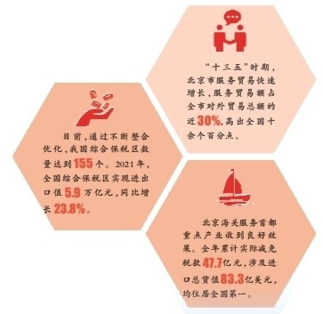 兩年多來,北京“兩區(qū)”建設(shè)成效突出、亮點(diǎn)紛呈。作為創(chuàng)新示范者,北京海關(guān)助力天竺綜保區(qū)加快打造具有服務(wù)貿(mào)易特色的綜合保稅區(qū),為北京開放發(fā)展先行先試前沿政策,為我國海關(guān)特殊監(jiān)管區(qū)域創(chuàng)新發(fā)展探索經(jīng)驗(yàn)。2021年度,天竺綜保區(qū)進(jìn)出口值、營業(yè)收入、屬地稅收分別同比增長37.6%、25.1%、22.1%,其中藥品藥械、文化藝術(shù)品進(jìn)口規(guī)模分別占到全國總量的1/5、1/3。目前,園區(qū)形成了醫(yī)療健康、文化貿(mào)易、升級(jí)型消費(fèi)、航空服務(wù)等重點(diǎn)產(chǎn)業(yè)。