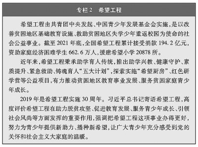 教育機會更加均等。中國教育事業(yè)優(yōu)先發(fā)展不斷深化,中國青年享有更加平等、更高質量的教育機會。2021年,中國義務教育鞏固率達95.4%;高中階段毛入學率達91.4%;高等教育毛入學率達57.8%、在學總規(guī)模達4430萬人,居世界第一,越來越多的青年打開了通往成功成才大門的重要路徑。覆蓋學前教育至研究生教育的學生資助政策體系建成且日趨完善,2020年資助資金總額超過2400億元、資助學生近1.5億人次,實現(xiàn)“三個全覆蓋”②。義務教育階段進城務工人員隨遷子女、農村和貧困地區(qū)學生等群體受教育權益得到充分保障。2020年,85.8%的進城務工人員隨遷子女在公辦學校就讀或享受政府購買學位服務;2012年至2021年,農村和貧困地區(qū)重點高校專項招生計劃定向招生超過82萬人,讓更多的青年公平享有接受更好教育的機會,阻斷貧困的代際傳遞。