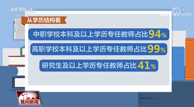 據(jù)介紹,全國職業(yè)學(xué)校專任教師規(guī)模從2012年的111萬人增加到2021年的129萬人,增幅為17%。從學(xué)歷結(jié)構(gòu)看,中職學(xué)校本科及以上學(xué)歷專任教師占比94%,高職學(xué)校本科及以上學(xué)歷專任教師占比99%,研究生及以上學(xué)歷專任教師占比41%。