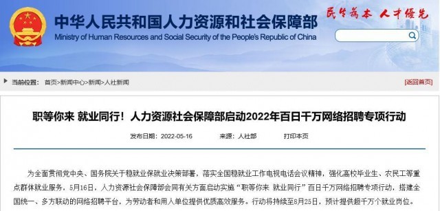 近日,人力資源和社會保障部會同有關方面啟動實施“職等你來 就業(yè)同行”百日千萬網絡招聘專項行動,搭建全國統(tǒng)一、多方聯(lián)動的網絡招聘平臺。行動將持續(xù)至8月25日,預計提供超千萬個就業(yè)崗位。此次專項行動主會場設在:中國公共招聘網、中國國家人才網、“就業(yè)在線”,并開設就業(yè)導引地圖,鏈接各省招聘分會場和相關社會參與方。