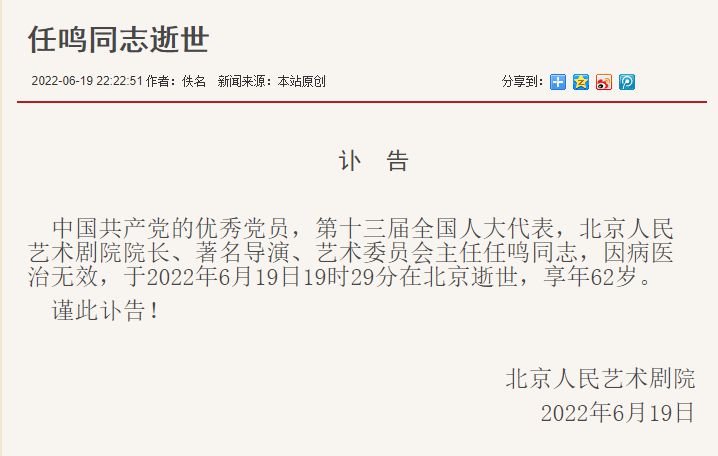 中國(guó)共產(chǎn)黨的優(yōu)秀黨員,第十三屆全國(guó)人大代表,北京人民藝術(shù)劇院院長(zhǎng)、著名導(dǎo)演、藝術(shù)委員會(huì)主任任鳴同志,因病醫(yī)治無(wú)效,于2022年6月19日19時(shí)29分在北京逝世,享年62歲。