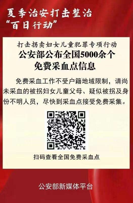 公安部公布全國5000余個免費采血點信息 助力被拐家庭早日實現(xiàn)團圓 免費采血工作不受戶籍地域限制