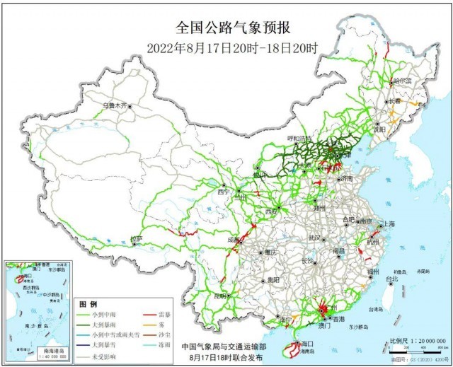 8月17日20時至18日20時,內(nèi)蒙古中部偏南地區(qū)、遼寧西部、青海東部、甘肅中東部、寧夏、陜西北部、山西北部、河北中北部、北京、天津、廣東西南部等地部分地區(qū)有中到大雨,其中,內(nèi)蒙古中部偏南地區(qū)、陜西北部、山西北部、河北東北部、北京北部、天津北部等地部分地區(qū)有暴雨,內(nèi)蒙古中部偏南地區(qū)、山西北部等地部分地區(qū)有大暴雨。河北中南部、黑龍江西北部和南部、浙江西部和東北部、廣東中部、廣西東南部、海南島大部、四川中部、西藏東北部、寧夏南部等地局地有雷暴。另外,遼寧東部、吉林中東部、福建東部、廣西東南部、云南東北部等地局地有霧。受大到暴雨影響的主要路段有: