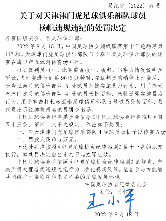18日晚,中國(guó)足協(xié)網(wǎng)站發(fā)布4則球員、俱樂(lè)部官員違規(guī)違紀(jì)的處罰決定,中超天津津門虎球員楊帆、中超長(zhǎng)春亞泰球員孫捷及中乙青島紅獅球員王建文均停賽5場(chǎng),中甲遼寧沈陽(yáng)城市足球俱樂(lè)部官員林濤6場(chǎng)比賽禁止進(jìn)入體育場(chǎng)。處罰決定全文如下: