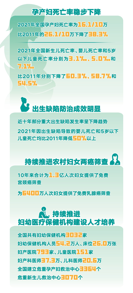除了“兩癌”篩查,過去10年,我國婦幼健康保障水平整體取得了較大進展。截至今年5月,全國共有婦幼保健機構(gòu)3032家,婦幼保健機構(gòu)專業(yè)人員54.2萬人,床位數(shù)26萬張。全國共有婦產(chǎn)醫(yī)院793家,兒童醫(yī)院151家,婦產(chǎn)科醫(yī)師37.3萬人,我國婦幼健康服務(wù)能力得到持續(xù)提升。