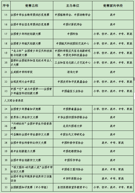 根據(jù)《教育部辦公廳等四部門關(guān)于印發(fā)<面向中小學(xué)生的全國性競賽活動管理辦法>的通知》精神,由主辦單位自主申報,經(jīng)組織專家進(jìn)行嚴(yán)格評審把關(guān),擬確定全國青少年人工智能創(chuàng)新挑戰(zhàn)賽等45項(xiàng)競賽為2022-2025學(xué)年面向中小學(xué)生開展的全國性競賽活動,舉辦時間原則上為2022年9月至2025年8月,在此期間每學(xué)年舉辦不得超過1次,累計不超過3次?,F(xiàn)就相關(guān)信息予以公示,公示期為2022年8月23日至29日。