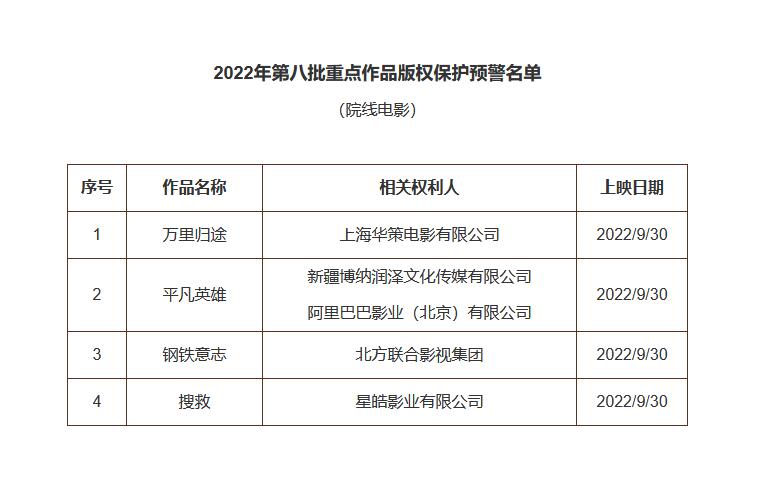 中新網(wǎng)9月30日電 據(jù)國(guó)家版權(quán)局29日消息,2022年度第八批重點(diǎn)作品版權(quán)保護(hù)預(yù)警名單公布,包含院線電影《萬里歸途》《平凡英雄》《鋼鐵意志》《搜救》。