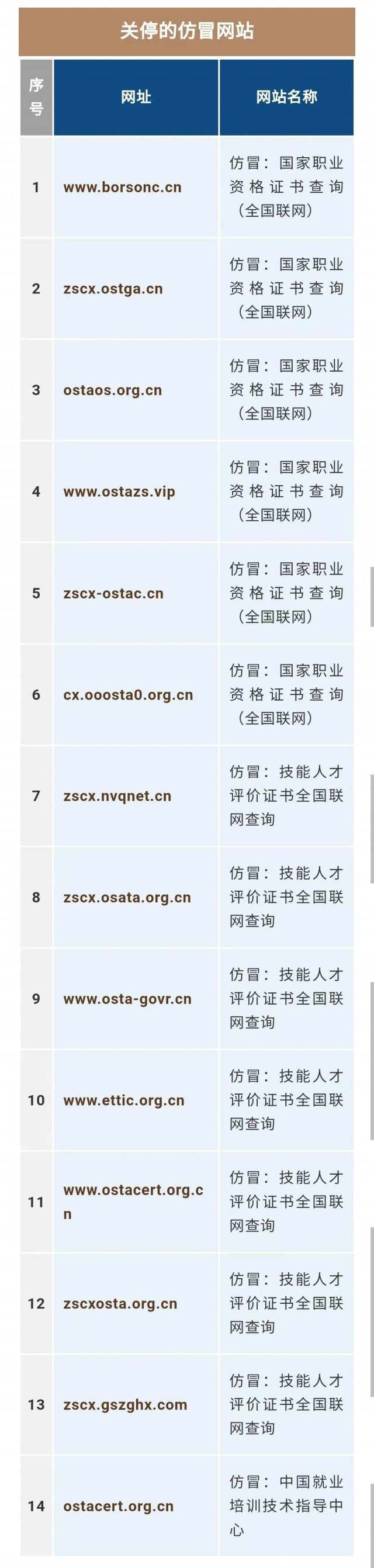 根據(jù)網(wǎng)絡(luò)巡查和群眾舉報情況,人力資源社會保障部聯(lián)合有關(guān)部門查實(shí)并關(guān)停了14個仿冒網(wǎng)站,其網(wǎng)站名稱、網(wǎng)址及頁面內(nèi)容與人力資源社會保障部技能類“職業(yè)資格證書”“職業(yè)技能等級證書”(以下簡稱技能類評價證書)查詢官方網(wǎng)站高度相似,容易誤導(dǎo)社會公眾。目前,上述14個網(wǎng)站均已被關(guān)停。