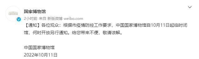 中國國家博物館:根據(jù)疫情防控要求,10月11日起臨時(shí)閉館