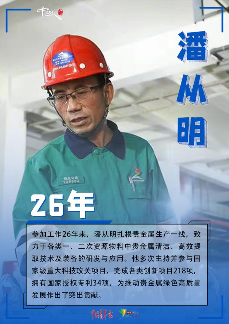 參加工作26年來,潘從明扎根貴金屬生產一線,致力于各類一、二次資源物料中貴金屬清潔、高效提取技術及裝備的研發(fā)與應用。他多次主持并參與國家級重大科技攻關項目,完成各類創(chuàng)新項目218項,擁有國家授權專利34項,為推動貴金屬綠色高質量發(fā)展作出了突出貢獻。