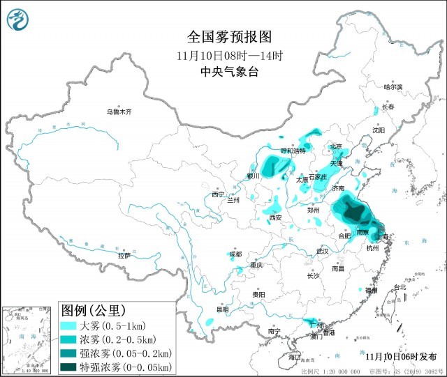中央氣象臺(tái)今天早晨繼續(xù)發(fā)布大霧黃色預(yù)警:預(yù)計(jì),11月10日早晨至上午,北京東部、天津、河北東北部和南部、山西東南部、山東西北部和南部、江蘇、安徽東部、上海、浙江北部以及陜西中北部、內(nèi)蒙古河套地區(qū)等地的部分地區(qū)將有能見(jiàn)度不足1公里的大霧天氣,其中,天津南部、江蘇北部、安徽東北部、上海、浙江北部以及內(nèi)蒙古河套地區(qū)等地的部分地區(qū)有能見(jiàn)度不足500米的濃霧,局地能見(jiàn)度不足50米。