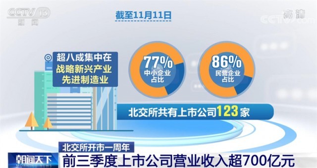 截至11月11日,北交所共有上市公司123家,其中,中小企業(yè)占比77%,民營企業(yè)占比86%,超八成集中在戰(zhàn)略新興產(chǎn)業(yè)、先進制造業(yè);49家為國家級“專精特新”小巨人企業(yè),平均研發(fā)強度達5.4%,高于社會平均水平,創(chuàng)新特征鮮明。