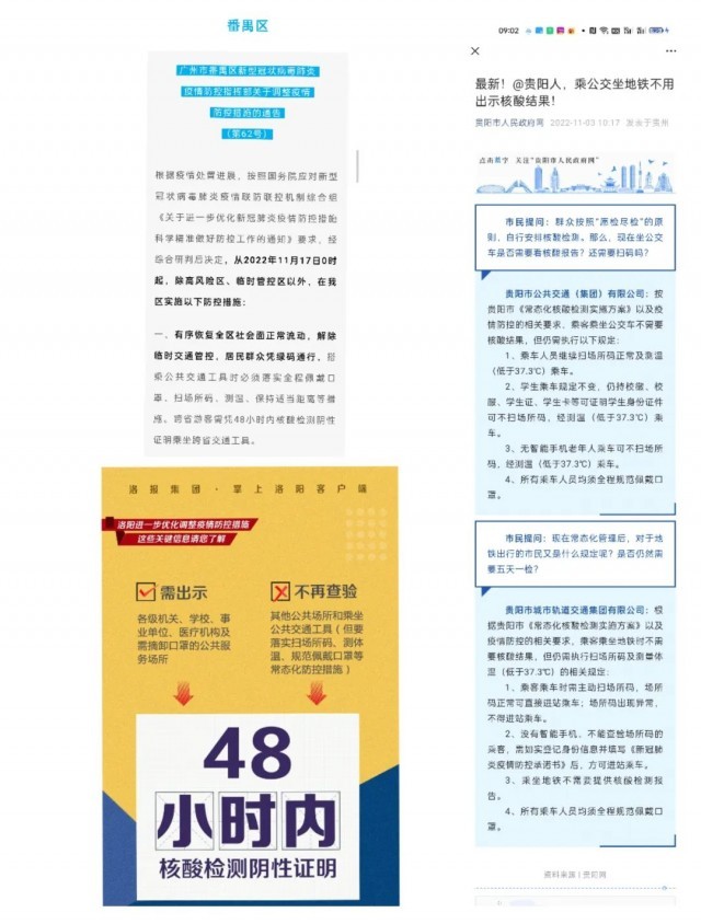 最早宣布取消的是貴陽(yáng)市。11月3日,“貴陽(yáng)市人民政府網(wǎng)”發(fā)布《最新!@貴陽(yáng)人,乘公交坐地鐵不用出示核酸結(jié)果!》,宣布根據(jù)貴陽(yáng)市《常態(tài)化核酸檢測(cè)實(shí)施方案》以及疫情防控的相關(guān)要求,乘客乘坐公交車(chē)和地鐵時(shí)均不需要查驗(yàn)核酸檢測(cè)結(jié)果。
