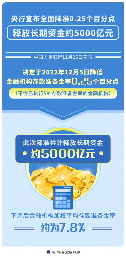 11月25日中國(guó)人民銀行宣布,決定于2022年12月5日降低金融機(jī)構(gòu)存款準(zhǔn)備金率0.25個(gè)百分點(diǎn)(不含已執(zhí)行5%存款準(zhǔn)備金率的金融機(jī)構(gòu))。這是年內(nèi)第二次降準(zhǔn),今年首次降準(zhǔn)已在4月落地。兩次降準(zhǔn)共降低金融機(jī)構(gòu)存款準(zhǔn)備金率0.5個(gè)百分點(diǎn)、釋放長(zhǎng)期資金超萬(wàn)億元,金融機(jī)構(gòu)加權(quán)平均存款準(zhǔn)備金率降至約7.8%。