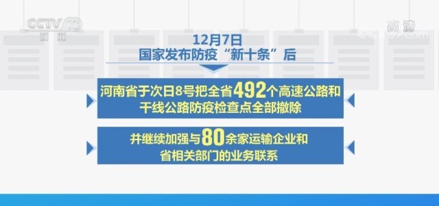 據(jù)了解,12月7日,國(guó)家發(fā)布防疫“新十條”后,河南省于次日把全省492個(gè)高速公路和干線公路防疫檢查點(diǎn)全部撤除,并繼續(xù)加強(qiáng)與80余家運(yùn)輸企業(yè)和省相關(guān)部門的業(yè)務(wù)聯(lián)系,充分發(fā)揮“12328服務(wù)監(jiān)督熱線+三級(jí)調(diào)度”機(jī)制作用,每日收集運(yùn)輸受阻問題,以便及時(shí)解決問題。