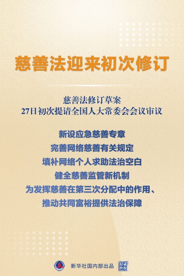 - 慈善法修訂草案提請審議:新設(shè)應(yīng)急慈善專章 完善網(wǎng)絡(luò)慈善規(guī)定 填補網(wǎng)絡(luò)個人求助法治空白