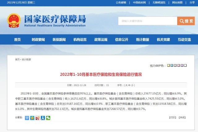 央視網(wǎng)消息:國家醫(yī)療保障局網(wǎng)站12月28日消息,2022年1-10月,全國基本醫(yī)療保險參保率穩(wěn)定在95%以上。基本醫(yī)療保險基金(含生育保險)總收入23677.15億元,同比增長6.9%。其中職工基本醫(yī)療保險基金(含生育保險)收入16251.6億元,同比增長8.8%。城鄉(xiāng)居民基本醫(yī)療保險基金收入7425.55億元,同比增長3.0%?;踞t(yī)療保險基金(含生育保險)總支出19187.16億元,同比增長0.9%,職工基本醫(yī)療保險基金(含生育保險)支出11918.58億元,同比增長1.0%,其中生育保險待遇支出702.13億元。城鄉(xiāng)居民基本醫(yī)療保險基金支出7268.57億元,同比增長0.7%。