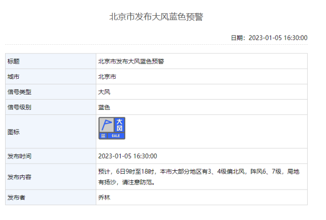 央視網(wǎng)消息:據(jù)北京氣象局網(wǎng)站消息,2023年01月05日16時(shí)30分,北京市氣象臺(tái)發(fā)布大風(fēng)藍(lán)色預(yù)警。