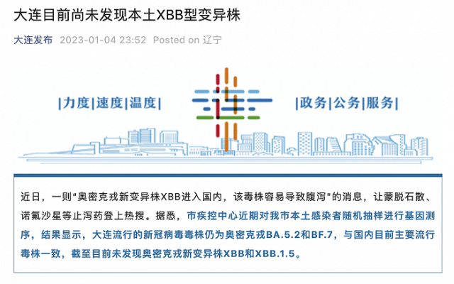 央視網(wǎng)消息:“大連發(fā)布”微信公眾號(hào)1月4日消息,近日,一則“奧密克戎新變異株XBB進(jìn)入國內(nèi),該毒株容易導(dǎo)致腹瀉”的消息,讓蒙脫石散、諾氟沙星等止瀉藥登上熱搜。據(jù)悉,大連市疾控中心近期對(duì)全市本土感染者隨機(jī)抽樣進(jìn)行基因測序,結(jié)果顯示,大連流行的新冠病毒毒株仍為奧密克戎BA.5.2和BF.7,與國內(nèi)目前主要流行毒株一致,截至目前未發(fā)現(xiàn)奧密克戎新變異株XBB和XBB.1.5。