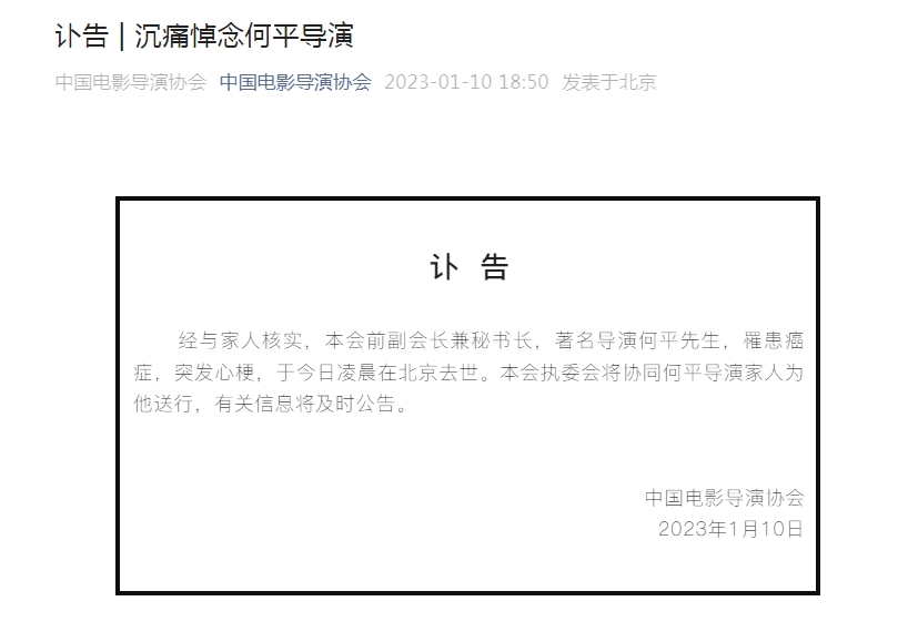中新網(wǎng)1月10日電 據(jù)中國電影導演協(xié)會消息,經(jīng)與家人核實,中國電影導演協(xié)會前副會長兼秘書長,著名導演何平先生,罹患癌癥,突發(fā)心梗,于1月10日凌晨在北京去世。中國電影導演協(xié)會執(zhí)委會將協(xié)同何平導演家人為他送行,有關(guān)信息將及時公告。