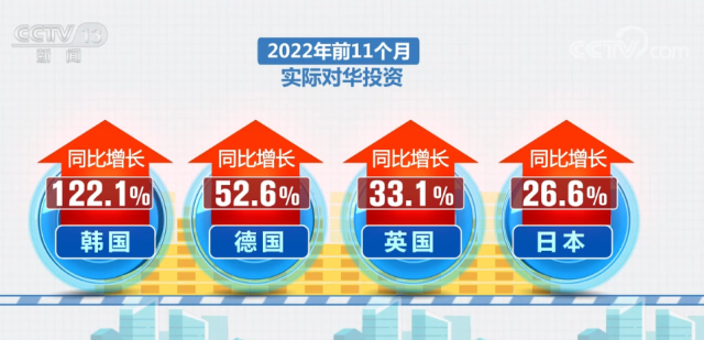 2022年前9個月,中國吸收外資規(guī)模就達到1萬億元;前11個月,突破1.15萬億元,超過2021年全年水平;與此同時,外資來源更加多元。2022年前11個月,韓國、德國、英國、日本等國家的實際對華投資同比分別增長122.1%、52.6%、33.1%和26.6%。