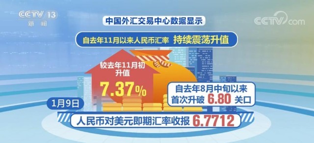 從去年底到今年開年至今,人民幣匯率走出了一波反彈回升行情。中國(guó)外匯交易中心數(shù)據(jù)顯示,自去年11月以來(lái)人民幣匯率持續(xù)震蕩升值。1月9日人民幣對(duì)美元即期匯率收?qǐng)?bào)6.7712,較去年11月初升值7.37%,也是自去年8月中旬以來(lái)首次升破6.80關(guān)口。