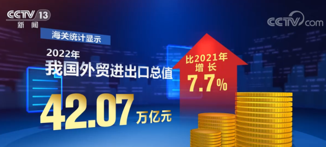 海關(guān)統(tǒng)計顯示,2022年,我國外貿(mào)進出口總值42.07萬億元,比2021年增長7.7%。其中,出口23.97萬億元,增長10.5%;進口18.1萬億元,增長4.3%。