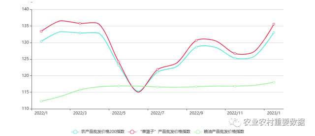 央視網(wǎng)消息:據(jù)農(nóng)業(yè)農(nóng)村重要數(shù)據(jù)公眾號消息,2023年1月,全國農(nóng)產(chǎn)品批發(fā)價格200指數(shù)為133.04,環(huán)比上漲7.16個點, 同比上漲2.66個點;菜籃子產(chǎn)品指數(shù)為135.57,環(huán)比上漲8.22個點,同比上漲2.15個點;糧油產(chǎn)品指數(shù)為118.01,環(huán)比上漲0.92個點,同比上漲5.73個點。