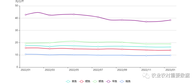 2023年1月,帶魚批發(fā)價格為38.41元/公斤,比上月上漲3.03%;草魚、鯉魚、鯽魚和鰱魚批發(fā)價格分別為16.47元/公斤、13.84元/公斤、18.98元/公斤、9.66元/公斤,與上月基本持平。
