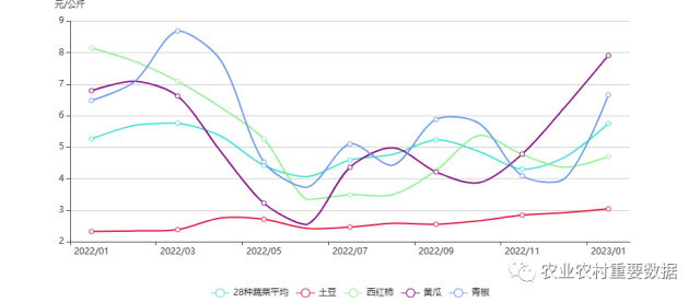 2023年1月,28種蔬菜平均批發(fā)價格為5.75元/公斤,環(huán)比上漲22.60%,其中:土豆、西紅柿、黃瓜和青椒批發(fā)價格分別為3.04元/公斤、4.70元/公斤、7.91元/公斤、6.66元/公斤,比上月分別上漲4.11%、7.80%、25.76%、65.67%。