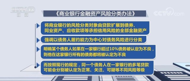 辦法還要求商業(yè)銀行應(yīng)至少每季度對(duì)全部金融資產(chǎn)進(jìn)行一次風(fēng)險(xiǎn)分類,有效防范化解信用風(fēng)險(xiǎn)。這一辦法將從今年7月1日起施行。