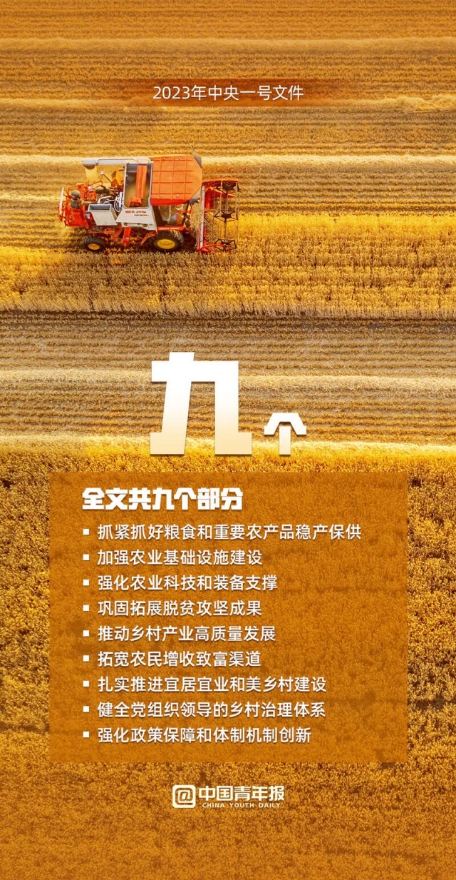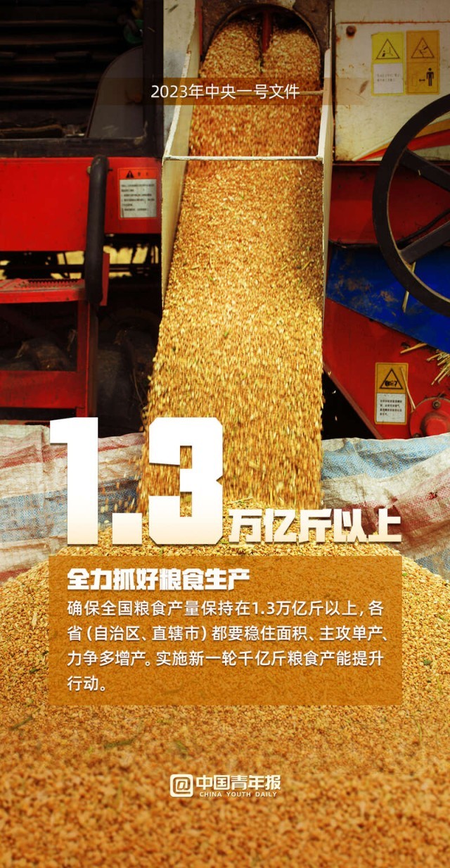 中國(guó)青年報(bào)客戶端訊(中青報(bào)·中青網(wǎng)見(jiàn)習(xí)記者 魏婉 制圖 程璨)“確保全國(guó)糧食產(chǎn)量保持在1.3萬(wàn)億斤以上、確保脫貧勞動(dòng)力就業(yè)規(guī)模穩(wěn)定在3000萬(wàn)人以上……”2月13日,2023年中央一號(hào)文件正式發(fā)布,這份文件題為《中共中央 國(guó)務(wù)院關(guān)于做好2023年全面推進(jìn)鄉(xiāng)村振興重點(diǎn)工作的意見(jiàn)》,全文共九個(gè)部分。文件提出,堅(jiān)決守牢確保糧食安全、防止規(guī)模性返貧等底線,扎實(shí)推進(jìn)鄉(xiāng)村發(fā)展、鄉(xiāng)村建設(shè)、鄉(xiāng)村治理等重點(diǎn)工作,加快建設(shè)農(nóng)業(yè)強(qiáng)國(guó),建設(shè)宜居宜業(yè)和美鄉(xiāng)村。
