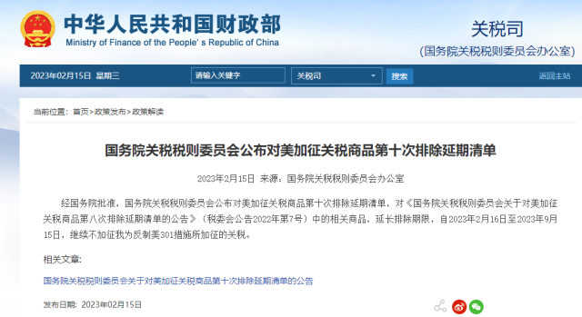 經(jīng)國務(wù)院批準(zhǔn),國務(wù)院關(guān)稅稅則委員會公布對美加征關(guān)稅商品第十次排除延期清單,對《國務(wù)院關(guān)稅稅則委員會關(guān)于對美加征關(guān)稅商品第八次排除延期清單的公告》(稅委會公告2022年第7號)中的相關(guān)商品,延長排除期限,自2023年2月16日至2023年9月15日,繼續(xù)不加征我為反制美301措施所加征的關(guān)稅。