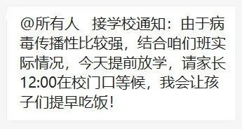 今天(2月20日)早上,一張截圖在部分金華市民朋友圈中傳播。金華一學(xué)校發(fā)布了提前放學(xué)通知:“由于病毒傳播性比較強(qiáng),結(jié)合咱們班實(shí)際情況,今天提前放學(xué),請(qǐng)家長(zhǎng)12:00在校門口等候?!?/p>