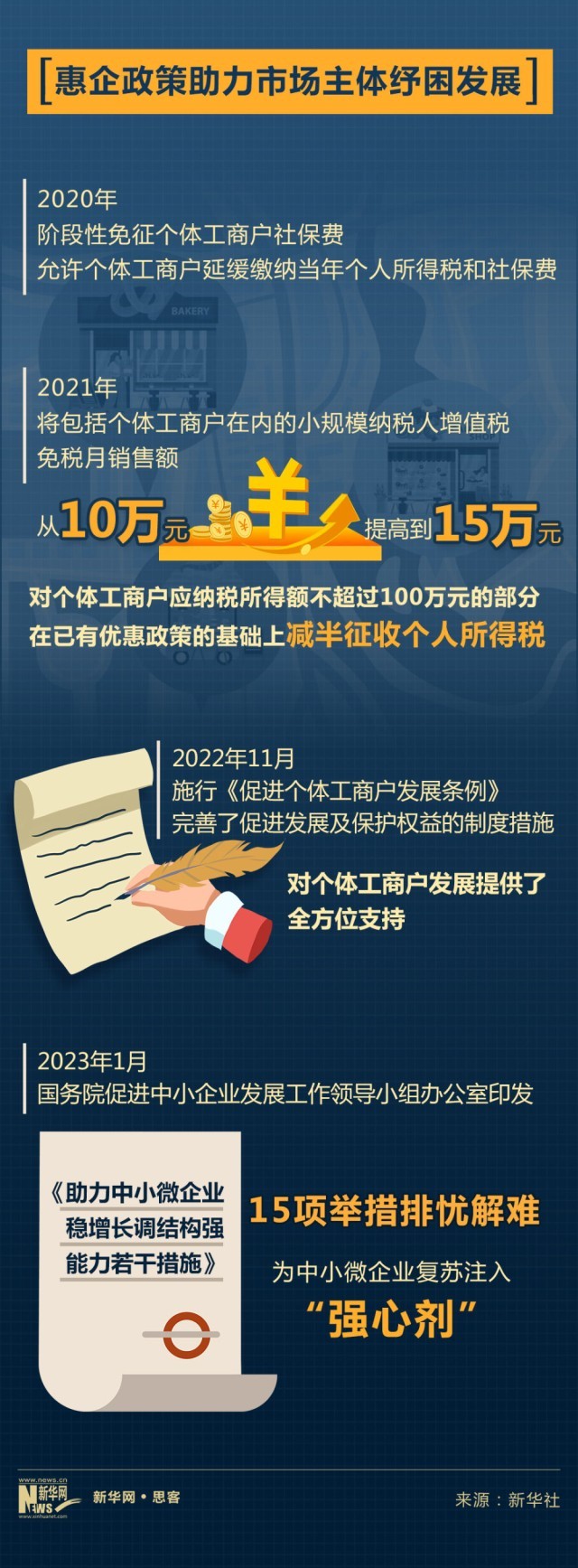 2022年11月《促進個體工商戶發(fā)展條例》施行,完善了促進發(fā)展及保護權(quán)益的制度措施,從登記注冊、經(jīng)營場所供給以及資金、財稅、金融、社保、創(chuàng)業(yè)就業(yè)、社區(qū)便民、知識產(chǎn)權(quán)保護等多方面,對個體工商戶發(fā)展提供了全方位支持。條例實施首月,全國新登記個體工商戶204.03萬戶,環(huán)比增長14.9%,有效激發(fā)了個體工商戶創(chuàng)業(yè)創(chuàng)新活力。