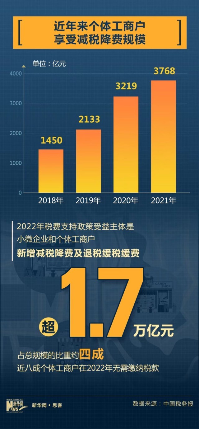 2021年,我國將包括個體工商戶在內(nèi)的小規(guī)模納稅人增值稅免稅月銷售額從10萬元提高到15萬元,對個體工商戶應(yīng)納稅所得額不超過100萬元的部分,在已有優(yōu)惠政策的基礎(chǔ)上減半征收個人所得稅。