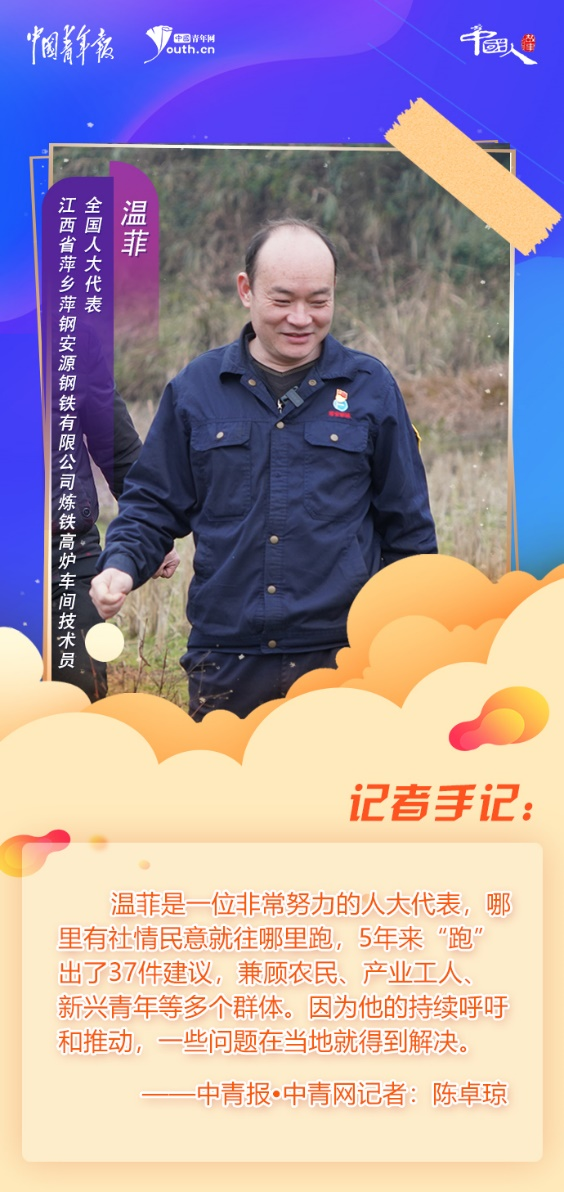 溫菲是一位非常努力的人大代表,哪里有社情民意就往哪里跑,5年來“跑”出了37件建議,兼顧農(nóng)民、產(chǎn)業(yè)工人、新興青年等多個(gè)群體。因?yàn)樗某掷m(xù)呼吁和推動(dòng),一些問題在當(dāng)?shù)鼐偷玫浇鉀Q。