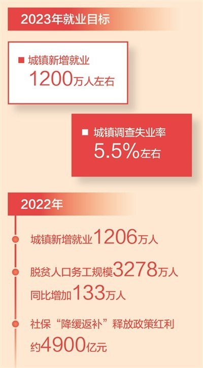 政府工作報告提出今年發(fā)展主要預(yù)期目標(biāo)中,城鎮(zhèn)新增就業(yè)1200萬人左右,城鎮(zhèn)調(diào)查失業(yè)率5.5%左右。
