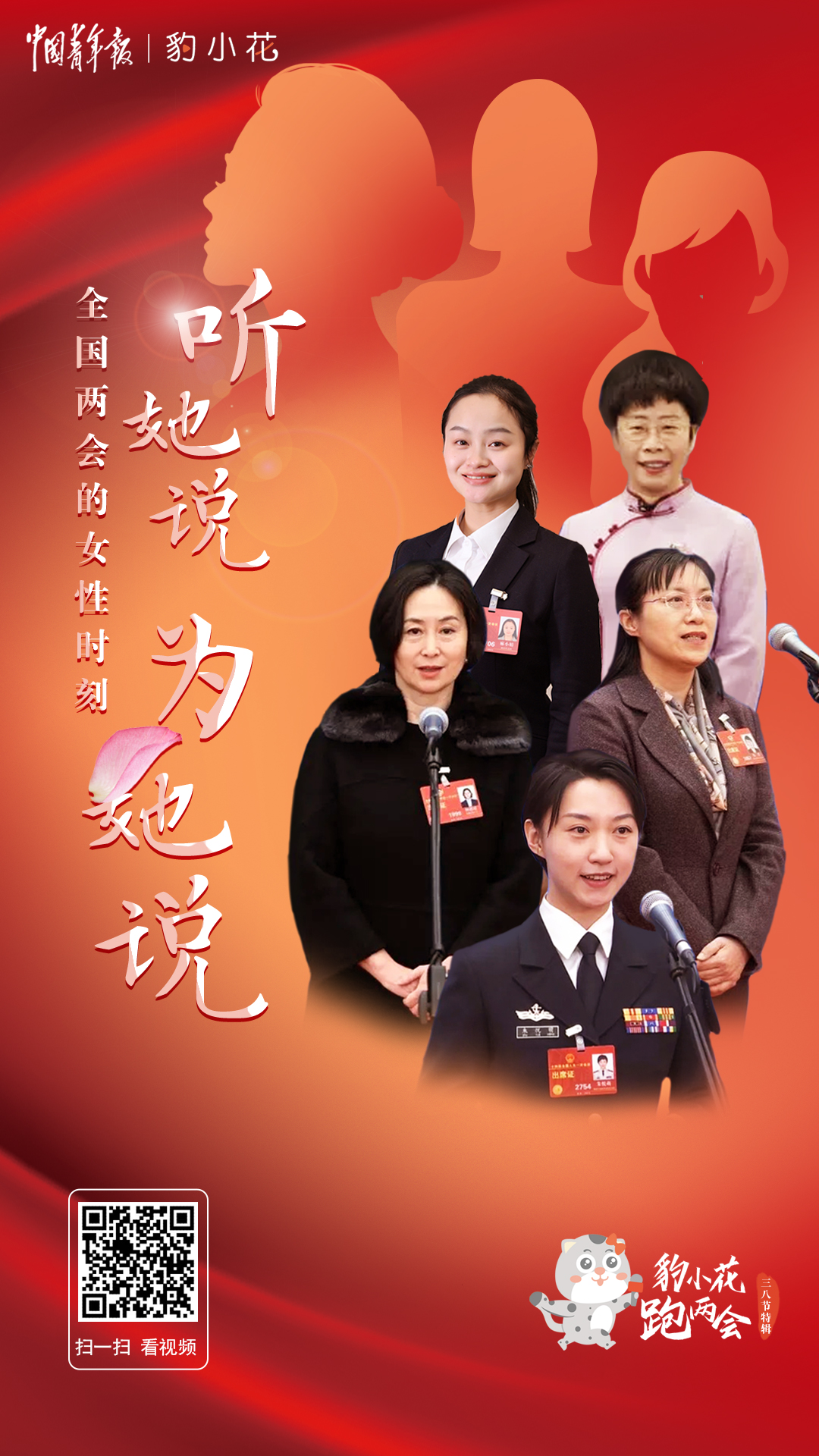 在今年全國兩會上,一位位女性代表委員履職建言,貢獻(xiàn)“她的聲音”:95后代表朱悅萌把青春和夢想融入祖國的航母事業(yè),她說,“艦艏行處是長城,國家利益所至,海軍航跡必達(dá)!”水慶霞代表說起中國女足的熱愛與堅持,鏗鏘玫瑰永不言敗。中國殘疾人聯(lián)合會理事楊洋委員說:“被光照耀的我們也想成為光照耀別人。”……同時,也有不少代表委員在為女性群體的利益發(fā)聲。豹小花跑兩會今天推出三八國際婦女節(jié)特輯,和你一起關(guān)注全國兩會上的“女性時刻”。