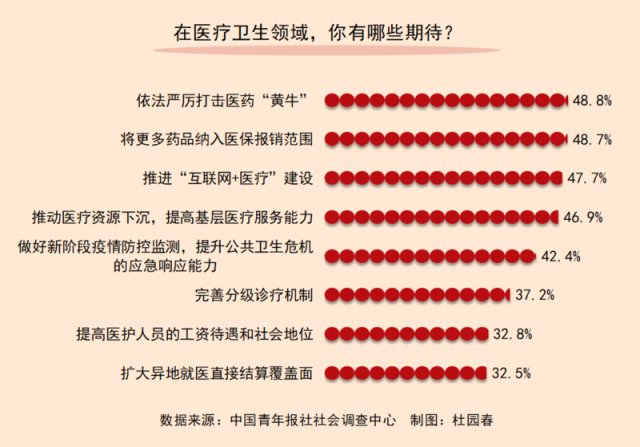在醫(yī)療衛(wèi)生領(lǐng)域,大家有哪些期待?調(diào)查顯示,依法嚴(yán)厲打擊醫(yī)藥“黃?!保?8.8%)的呼聲最高,其次是將更多藥品納入醫(yī)保報銷范圍(48.7%),然后是:推進“互聯(lián)網(wǎng)+醫(yī)療”建設(shè)(47.7%)和推動醫(yī)療資源下沉,提高基層醫(yī)療服務(wù)能力(46.9%)。