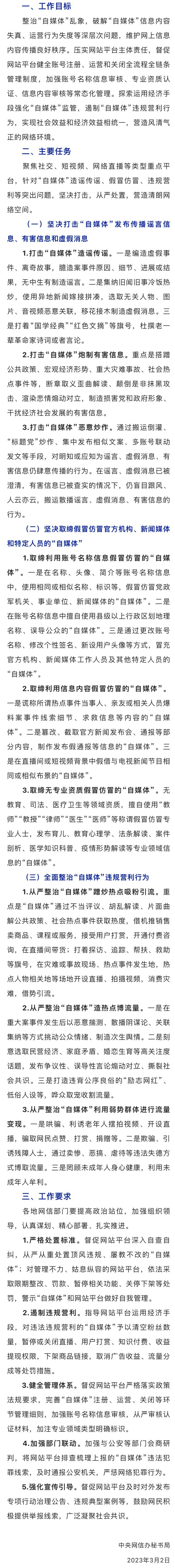 近日,中央網(wǎng)信辦印發(fā)通知,自即日起,開展為期兩個月的“清朗·從嚴整治‘自媒體’亂象”專項行動。具體內容如下: