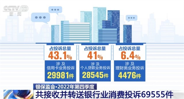 2022年第四季度,中國銀保監(jiān)會及其派出機構共接收并轉送銀行業(yè)消費投訴69555件。其中,涉及信用卡業(yè)務投訴29981件,占投訴總量的43.1%;涉及個人貸款業(yè)務投訴28545件,占投訴總量的41%;涉及理財類業(yè)務投訴4476件,占投訴總量的6.4%。