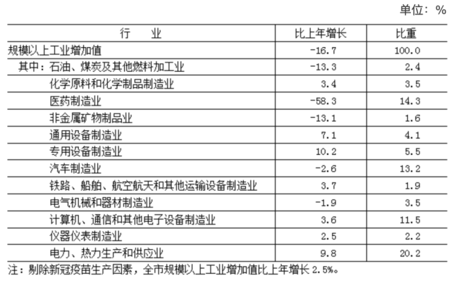 全年實現(xiàn)工業(yè)增加值5036.4億元,按不變價格計算,比上年下降14.6%。其中,規(guī)模以上工業(yè)[4]增加值下降16.7%,剔除新冠疫苗生產(chǎn)因素增長2.5%。在規(guī)模以上工業(yè)中,電力、熱力生產(chǎn)和供應業(yè)增長9.8%,計算機、通信和其他電子設備制造業(yè)增長3.6%,汽車制造業(yè)下降2.6%,醫(yī)藥制造業(yè)下降58.3%(剔除新冠疫苗生產(chǎn)因素后增長6.4%)。規(guī)模以上工業(yè)實現(xiàn)銷售產(chǎn)值22366.3億元,下降5.7%。其中,內(nèi)銷產(chǎn)值20560.5億元,下降1.8%;出口交貨值1805.8億元,下降35.0%。
