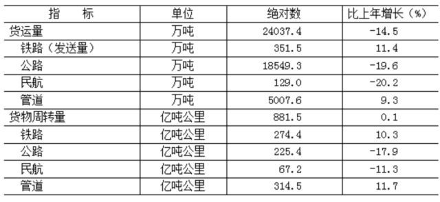 全年貨運量24037.4萬噸,比上年下降14.5%;貨物周轉量881.5億噸公里,增長0.1%。全年客運量28057.7萬人,下降33.7%;旅客周轉量580.5億人公里,下降44.6%。