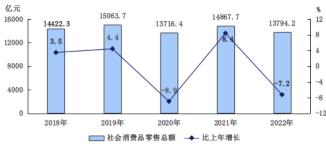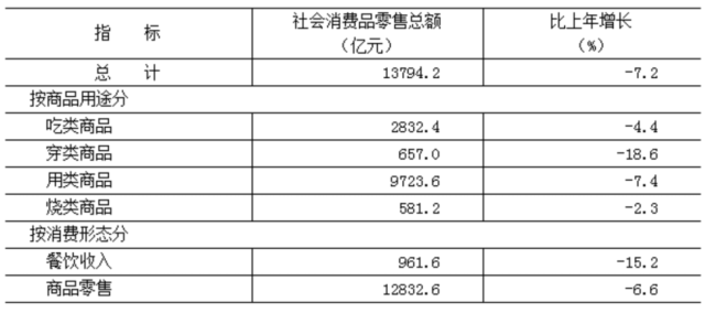 全年市場總消費額比上年下降4.9%。其中,服務性消費額下降2.9%;實現(xiàn)社會消費品零售總額13794.2億元,下降7.2%。