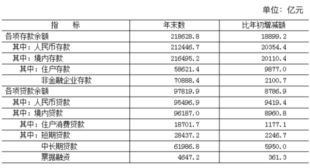 年末全市金融機構(含外資)本外幣存款余額218628.8億元,比年初增加18899.2億元。全市金融機構(含外資)本外幣貸款余額97819.9億元,比年初增加8786.9億元。