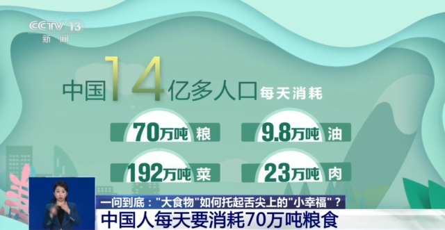 中國農(nóng)業(yè)科學(xué)院研究員 國家食物與營養(yǎng)咨詢委員會(huì)主任 陳萌山:過去我們吃飯,主要是主糧,一大碗米飯或者一點(diǎn)咸菜,一點(diǎn)辣椒。那么現(xiàn)在不一樣了,我們一小碗米飯很多菜,不僅僅是主食,副食老百姓要求更高。我們講直接消費(fèi)的口糧,已經(jīng)由1978年的人均248公斤,下降到目前的130公斤,所以副食也成為主食了。為了適應(yīng)這樣一個(gè)新的形勢(shì),總書記提出“大食物觀”。