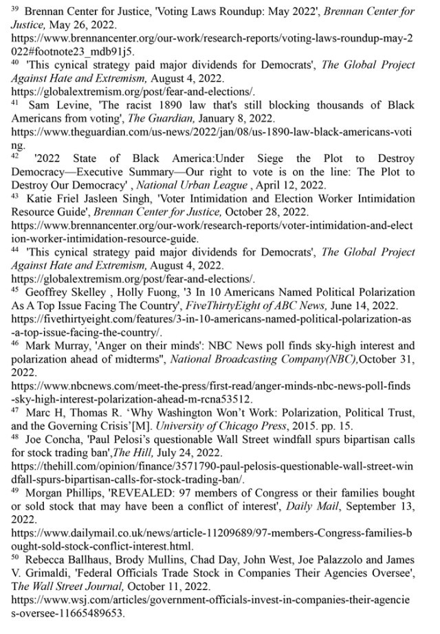 多重手法并用操弄選舉結(jié)果?!霸S多美國人完全摒棄了平等的觀念,而常常正是由這些摒棄平等觀念的人制定他人不得不遵守的規(guī)則。”(注38)限制選民投票資格的法律頻繁出臺。布倫南司法中心2022年5月26日發(fā)表的研究指出,2021年美國有18個州通過了34項限制投票的法律。在2022年的立法季,有39個州的立法機關(guān)審議了至少393項限制性法案,通過設(shè)置一系列投票障礙,極大地制約了有色人種選民行使投票權(quán)。亞利桑那州頒布了規(guī)制選民登記中提供身份證明文件的法律,多達20萬名選民可能面臨被取消登記的風(fēng)險。(注39)“全球反對仇恨和極端主義組織”2022年8月4日發(fā)表題為《美國人的恐懼感抑制民主參與》的報告指出,40%的非洲裔和37%的拉美裔美國人擔(dān)心被剝奪投票權(quán)利。(注40)英國《衛(wèi)報》網(wǎng)站2022年1月8日發(fā)表題為《1890年的種族主義法律仍在阻止成千上萬的美國黑人投票》的文章指出,嚴苛的投票資格法律阻止了密西西比州近16%適齡投票的非洲裔美國人進行投票。該州作為非洲裔最集中的地區(qū)之一,一個多世紀以來從未選舉出一名非洲裔擔(dān)任公職。(注41)“美國城市聯(lián)盟”2022年4月12日發(fā)布《2022年非洲裔美國人狀況報告:摧毀民主的陰謀籠罩之下》指出,過去一年,有20個州利用人口普查數(shù)據(jù)重新劃分選區(qū),剝奪了非洲裔等大量少數(shù)族裔選民的投票權(quán)。(注42)這些操縱選舉的手段變相剝奪了大量選民的投票資格,平等的選舉權(quán)名存實亡。