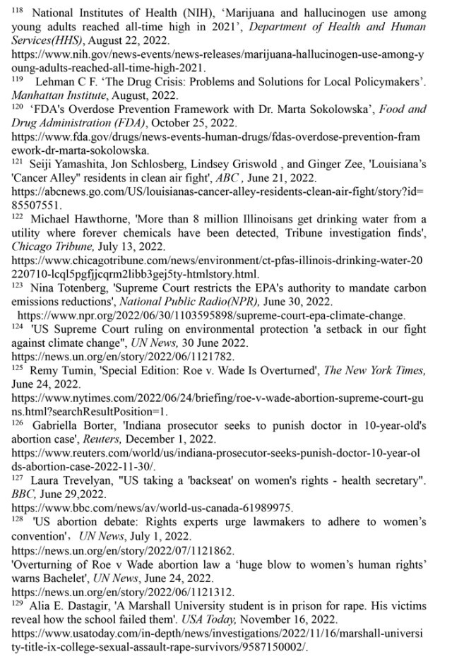 聯(lián)合國消除種族歧視委員會2022年9月21日發(fā)布的關(guān)于審議美國履行《消除一切形式種族歧視國際公約》情況的結(jié)論性報告指出,美國歷史上殖民主義和奴隸制留下的陰影至今仍揮之不去,助長著美國社會流行的種族主義。近幾年來,美國仇恨犯罪和仇恨言論事件顯著增加,與種族有關(guān)的槍支死傷人數(shù)大幅增加,有色人種和少數(shù)族裔在醫(yī)療、教育、住房等領(lǐng)域持續(xù)面臨系統(tǒng)性歧視。(注57)